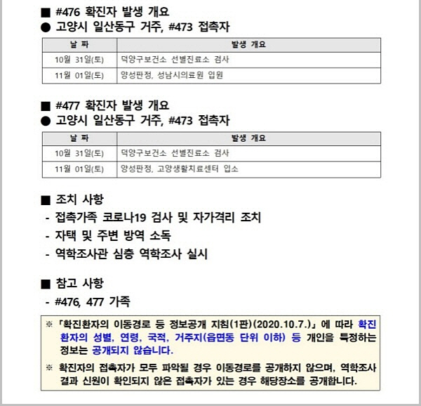 일산동구에 거주하는 476번과 477번째 확진자는 고양시 473번째 확진자(10월 31일 확진, 감염경로 조사 중)의 가족으로, 지난 31일 덕양구보건소 선별진료소에서 코로나19 검사를 실시해 1일 오전 확진판정 받았다. 보건소는 확진자들에 대한 격리병상 배정을 요청하고 심층역학조사를 실시할 예정이다.