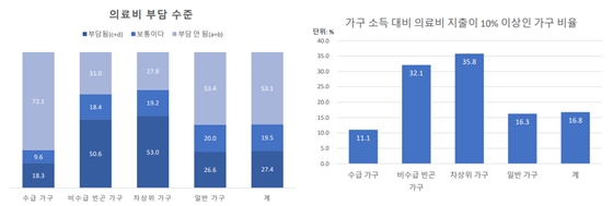 의료비에 대한 가구 부담 수준을 분석한 결과 의료급여 수급 가구에서 의료비 지출이 부담된다고 응답한 가구 비율은 18.3%로 일반 가구(26.6%)보다 낮았다.