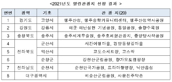 ▲ 2021년도 열린관광지 선정 결과.ⓒ문화체육관광부 최종 선정된 곳은 ▲경기 고양시(행주산성, 행주송학커뮤니티센터, 행주산성역사공원) ▲강원도 강릉시(허균‧허난설헌 기념공원, 통일공원, 솔향수목원) ▲충북 충주시(충주세계무술원, 충주호체험관광지, 중앙탑사적공원) ▲전북 군산시(시간여행마을, 경암동철길마을) ▲전북 익산시(교도소세트장, 고스락) ▲전북 순창군(강천산군립공원, 향가오토캠핑장) ▲전남 순천시(순천만국가공원, 드라마촬영장, 낙안읍성) ▲대구광역시(비슬산군립공원, 사문진주막촌) 등 총 20곳이다.