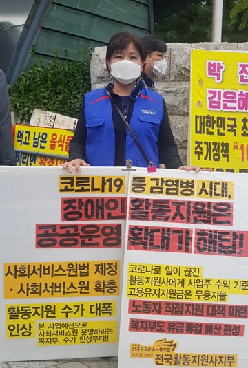 ▲ ‘코로나19 등 감염병 예방, 장애인 활동지원은 공공운영 확대가 해답!’ 피켓 모습.ⓒ에이블뉴스 “8월 말에 이용자 분께서 서울을 가셔서 어떤 공간에서 교육을 받았어요. 나중에 강사분이 확진 판정을 받고, 이용자분은 밀접접촉자로 분류돼 코로나 검사를 받은 거예요. 음성을 받았지만. 자가격리를 해야 한다고 해서 그분은 가족이 돌보고, 활동지원사는 2주간 무급으로 쉴 수밖에 없었죠, 활동지원사 남편분께서도 기저질환이 있어 혹시나 하는 위험 때문에, 모텔 생활을 하셨대요. 아무런 생계 지원이 없으니까 그분께서 굉장히 억울해하셨죠.”