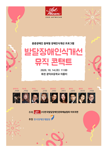 ▲ ‘발달장애인식개선 뮤직 콘택트’ 포스터. ⓒ한국발달장애인문화예술협회 아트위캔 한국발달장애인문화예술협회 아트위캔(대표 왕소영)이 오는 14일부터 강원도 화천 광덕초등학교를 시작으로 ‘발달장애인식개선 뮤직콘택트’를 진행한다.