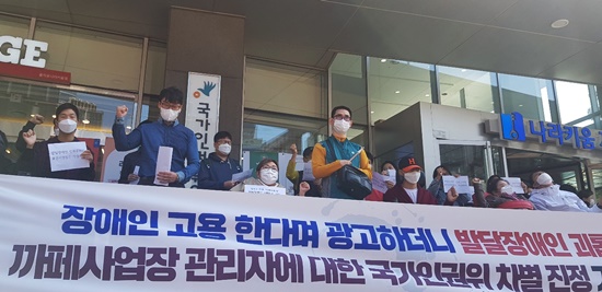 ▲ 장애인차별금지추진연대(장추련)는 5일 국가인권위원회 앞에서 기자회견을 갖고, A업체 사내카페에서 근무하던 발달장애인 이 모 씨 등이 직장에서 괴롭힘을 당했다며, A업체 대표이사 등을 상대로 진정서를 제출했다.ⓒ에이블뉴스 장애인고용을 내세우던 기업의 자회사형 장애인 표준사업장으로 설립된 사내카페에서 발달장애인들이 직장 내 괴롭힘을 당했다며 국가인권위원회에 호소했다.