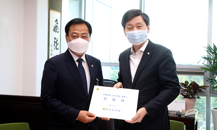 장현국 경기도의회 의장(더민주, 수원7)과 진용복 부의장(더민주, 용인3)·문경희 부의장(더민주, 남양주2) 등 의장단은 이날 오후 행안위 소속 한병도 의원(더민주)과 최춘식 의원(국민의힘), 김민철 의원(더민주) 등 여야 의원을 두루 접견하고, ‘지방자치법 전부개정법률(안)의 조속한 국회 의결을 위한 건의문’과 ‘지방의회 제도개선 관련 건의서’를 전달했다.