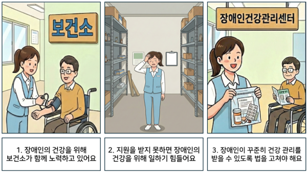 1 장애인의 건강을 위해 보건소가 함께 노력하고 있어요. 2 지원을 받지 못하면 장애인의 건강을 위해 일하기 힘들어요. 3 장애인이 꾸준히 건강 관리를 받을 수 있도록 법을 고쳐야 해요. ©AI 편집실