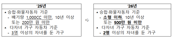 자동차 관련 기준도 완화된다. 10년 이상이거나 500만 원 미만인 소형 승합·화물차는 일반재산 환산율(월 4.17%)을 적용받게 되며, 자녀 2명 이상이면 다자녀 가구로 인정된다.