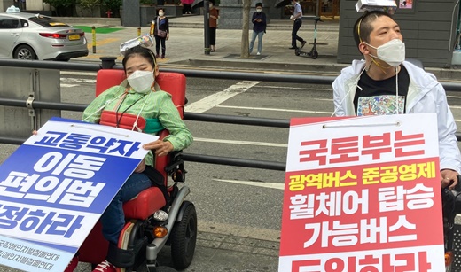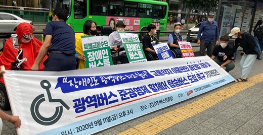 전국장애인차별철폐연대(전장연)가 11일 강남역 버스 정류장에서 기자회견을 갖고, 장애인도 광역버스를 탈 수 있도록 교통약자 이동편의 증진법 개정 및 광역버스 준공영제 시범사업에 휠체어가 탑승할 수 있는 저상버스를 도입할 것을 촉구했다.