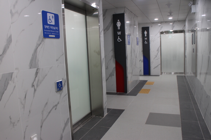 남녀장애인화장실은 맞이방 남녀비장애인화장실 입구에 설치돼 있어 성별이 다른 활동보조인의 도움을 받을 수 있다. 출입문도 손이 불편하거나 휠체어를 사용하는 장애인이 이용하기 편한 터치식자동문이다.