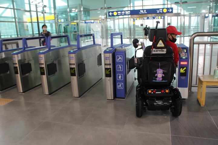 맞이방 개찰구에는 기존 회전문 게이트보다 경증장애인들도 안전하고 편리하게 이용을 하도록 슬림형 플랩게이트가 설치됐다. 여기에 휠체어 사용 장애인을 위한 슬림형 플랩게이트가 따로 설치됐으며, 한쪽 게찰구에는 시각장애인들 위한 점자블록이 바닥에 설치돼 있어 이용 불편이 없다.