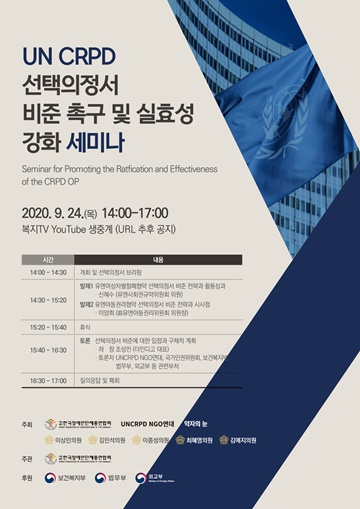 ▲ 유엔장애인권리협약(CRPD) 선택의정서 비준 촉구 및 이행 강화 방안 마련을 위한 세미나 포스터.ⓒ한국장애인단체총연합회 한국장애인단체총연합회(장총련)는 오는 24일 오후2시 복지TV 유튜브를 통해 유엔장애인권리협약(CRPD) 선택의정서 비준 촉구 및 이행 강화 방안 마련을 위한 세미나를 개최한다.