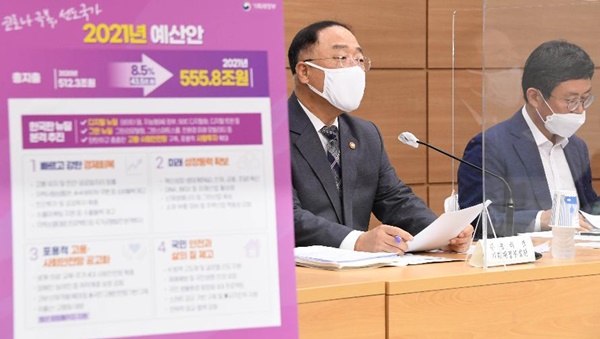 ▲ 홍남기 기획재정부 장관이 내년 예산안을 브리핑하고 있다.ⓒ기획재정부 정부가 내년 예산안을 올해 대비 43.5조원(8.5%) 증액한 총 555.8조원으로 편성해 3일 국회에 제출했다. 예산안은 3일 국회에 제출돼 법정 기한인 12월2일까지 심사를 거쳐 본회의를 통과해 최종 확정될 예정이다.