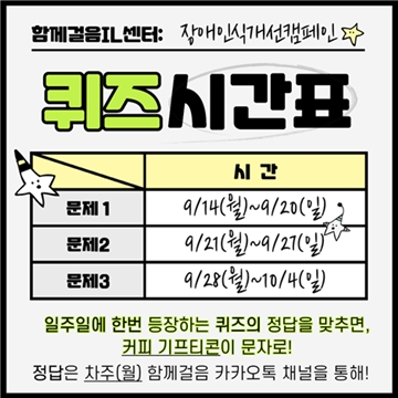 ▲ 온라인 장애인식개선캠페인 퀴즈 시간표. ⓒ함께걸음인천장애인자립생활센터 함께걸음인천장애인자립생활센터(이하 함께걸음IL센터)가 오는 14일부터 10월 5일까지 2차 온라인 장애인식개선캠페인을 진행한다.