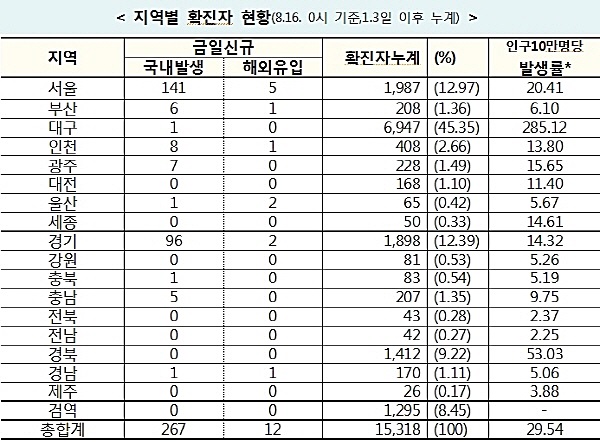 【고양인터넷신문】질병관리본부 중앙방역대책본부(본부장 정은경)는 8월 16일 0시 기준으로, 국내 발생 신규 확진자는 267명이 확인되었고, 해외유입 사례는 12명이 확인되어 총 누적 확진자수는 15,318명(해외유입 2,642명)이라고 밝혔다. 특히 확진자 중 서울 146명(해외유입 5명 포함), 경기도 98명(해외유입 2명 포함)으로 신규 확진자의 87.5%가 서울·경기도 환자들이다.