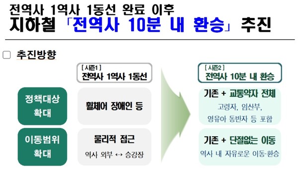 서울시는 이번 1역사 1동선 확보를 완성함과 동시에, 교통약자와 모든 시민을 위한 대중교통 시대로 전환하기 위해 ‘전 역사 10분내 환승’ 목표를 더해 지하철 혁신 사업을 이어간다.