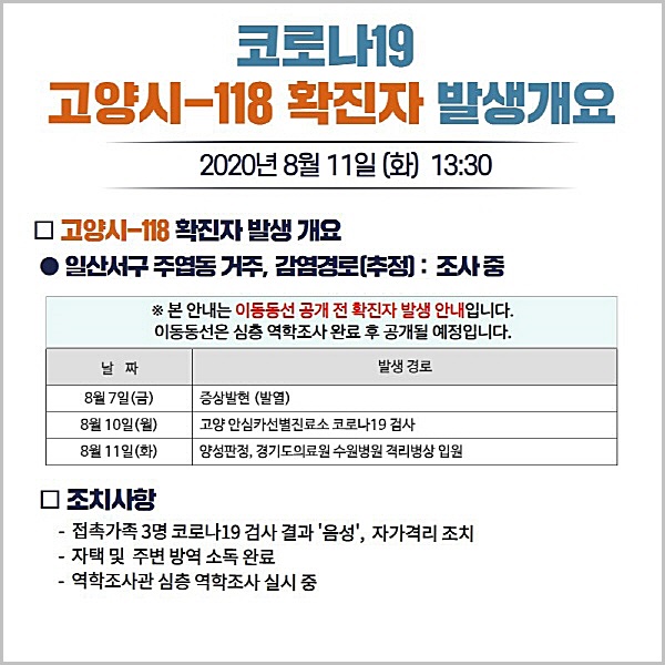 【고양인터넷신문】고양시에서 코로나19 118번째 확진자가 발생했다. 확진자는 일산서구 주엽동 거주자로 지난 7일 발열 등 이상증상이 나타나 8월 10일 덕양구 주교동의 ‘고양안심카 선별진료소’에 들러 코로나19 검사를 실시, 다음날인 11일 확진판정을 받아 경기도의료원 수원병원 격리병상에 입원했다.