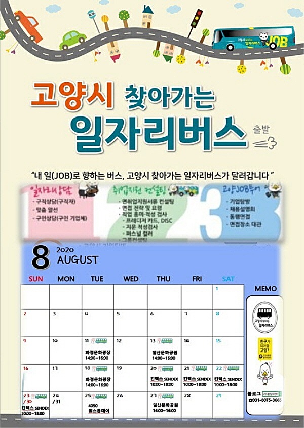 복사 목록 인쇄 【고양인터넷신문】고양시는 ‘가까운 현장에서 내 일(job)과 만나요’라는 슬로건으로 시민의 일자리지원 편의를 위해 ‘찾아가는 일자리버스’ 현장 일자리상담과 면접장을 8월 11일, 18일 화정문화광장과 13일, 27일 일산문화공원에서 각각 2회씩 총 4회 운영한다.