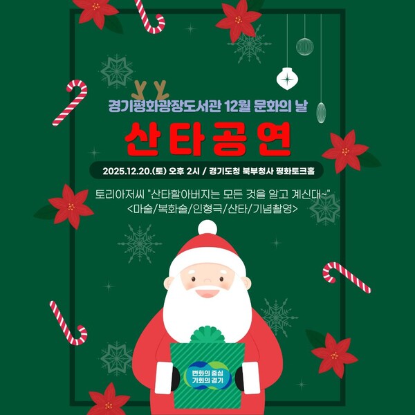 전성환 기자 : 경기도가 12월 19일과 20일 양일간 도 북부청사 평화토크홀에서 '모두가 함께하는 겨울 감성 공연–함께 읽고, 함께 웃는 하루'를 주제로 경기평화광장도서관 '12월 문화의 날' 행사를 개최한다.