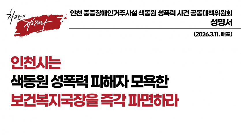 그럼에도 불구하고 인천시 보건복지국장은 시대착오적이고 반인권적인 표현을 서슴없이 사용하며 피해 사실을 부정했다. 이는 피해자들의 경험을 부정하고 모욕하는 명백한 2차 가해다. 처녀막은 성폭력 여부를 판단하는 기준이 될 수 없으며, 성폭력은 물적 증거만으로 입증되는 범죄가 아니다. 특히 중증장애인이 거주하는 시설에서 발생한 성폭력 사건은 피해자가 진술하기 어려운 조건, 폐쇄된 공간, 권력관계 등을 고려한 조사와 지원을 필요로 한다.
