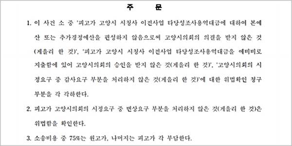 그리고 지난 9월 16일 의정부지방법원 제1행정부(재판장 이우희)는 고양시 시청사 백석 이전 행정사무와 관련한 주민소송 1심에서 “피고(고양시장)가 고양시의회의 시정요구 중 (타당성조사 용역비 예비비 지출에 대한) 변상 요구를 처리하지 않은 것은 위법하다”고 판결하며 원고 일부승소를 선고했다.