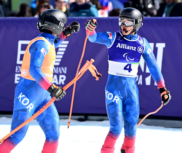 황민규(SK에코플랜트, 사진 오른쪽)는 9일(한국시간) 이탈리아 코르티나담페초 토파네 알파인스키 센터에서 열린 2026 밀라노·코르티나담페초 동계패럴림픽 알파인스키 남자 슈퍼대회전 시각장애 부문 결선에 김준형 가이드와 호흡을 맞춰 1분18초28을 기록, 8위에 자리했다. ©대한장애인체육회