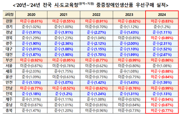 최근 5년간 장애인생산품 구매 외면한 교육청 3곳…법정 기준 단 한 번도 충족 못해