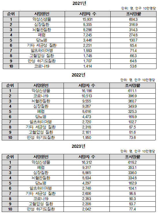 반면 최근 3년간(2021~2023년) 전체 장애인 인구의 사망원인은 악성신생물이 매년 1위를 차지했으며, 심장질환과 뇌혈관질환이 그 뒤를 이었다. 폐렴은 2023년 2위를 기록했지만, 1위에 오른 적은 없었다.