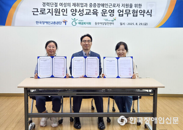 이흥재 기자 : 한국장애인고용공단(이사장 이종성)과 동부여성새로일하기센터, 사단법인 해냄복지회가 지난 8월 29일 경력단절 여성을 근로지원인으로 양성하기 위한 3자 업무협약(MOU)을 체결했다고 밝혔다.