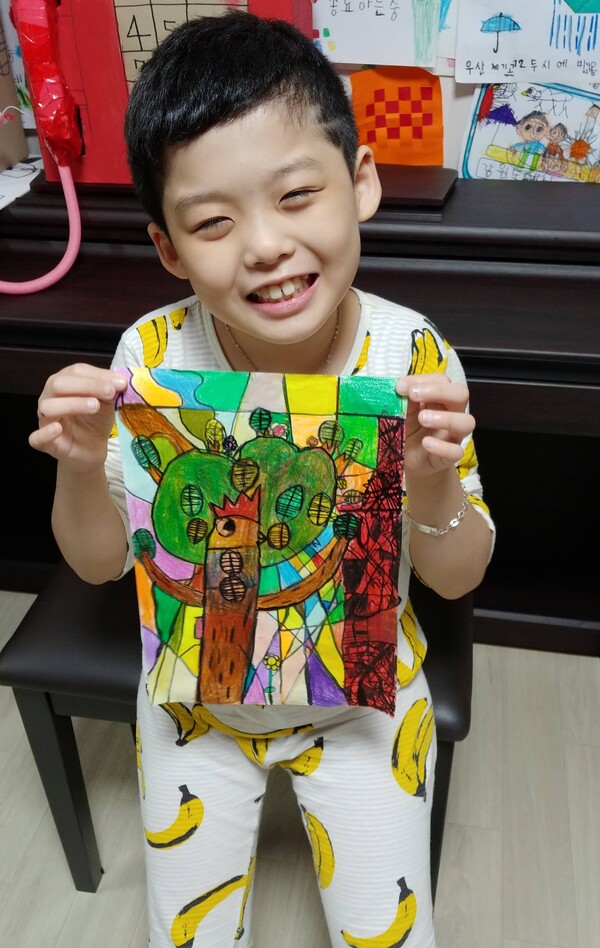 습작품이 완성되면 항상 사진찍기를 좋아했던 초등 2학년 시절 양예준 작가. ©장윤경