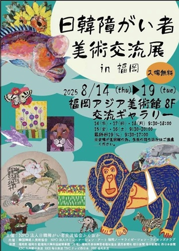 한일장애인미술교류전은 8월 14일부터 19일까지 일본 후쿠오카 시립미술관에서 진행된다. 이번 교류전은 한일 수교 60주년을 맞아 양국 장애 예술인의 문화예술을 통한 상호 이해와 우호 증진을 목적으로 기획된 행사로 한국에서는 약 53점의 작품과 21명 참여할 예정이다.