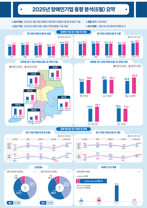 한편, 이번 조사는 전국 408개 장애인기업을 대상으로 지난 6월 21일부터 7월 8일까지 진행됐다. 조사 결과는 장애인기업종합지원센터 누리집(www.debc.or.kr)에서 확인할 수 있다.