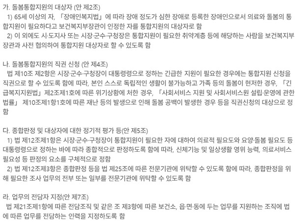 이번 시행령 및 시행규칙 제정은 내년 3월 27일 시행이 예정된 ‘돌봄통합지원법’의 위임사항 및 법 집행을 위해 필요한 세부사항을 정했다. 복지부는 지난 21일까지 입법예고를 진행했다.