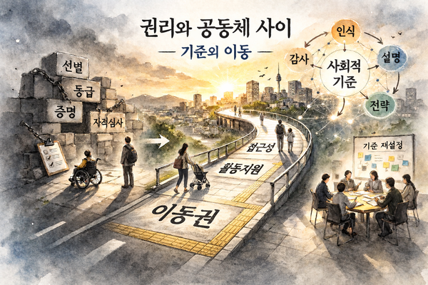 활동지원은 개인을 보조하는 제도가 아니라 노동과 돌봄의 균형을 유지하는 사회적 장치다. 접근성 역시 배려의 차원이 아니라 안전과 효율을 결정하는 설계 기준이다. 이렇게 볼 때 핵심은 ‘누구를 도울 것인가’가 아니라 ‘어떤 기준 위에서 사회를 운영할 것인가’라는 질문이다. 요구를 집단의 필요로만 설명하는 순간 그것은 협상의 대상이 되지만, 사회의 기본 기준으로 제시될 때 그것은 합의의 출발점이 된다. 언어를 바꾼다는 것은 표현을 바꾸는 일이 아니라, 기준의 위치를 이동시키는 일이다.