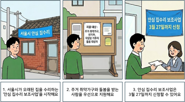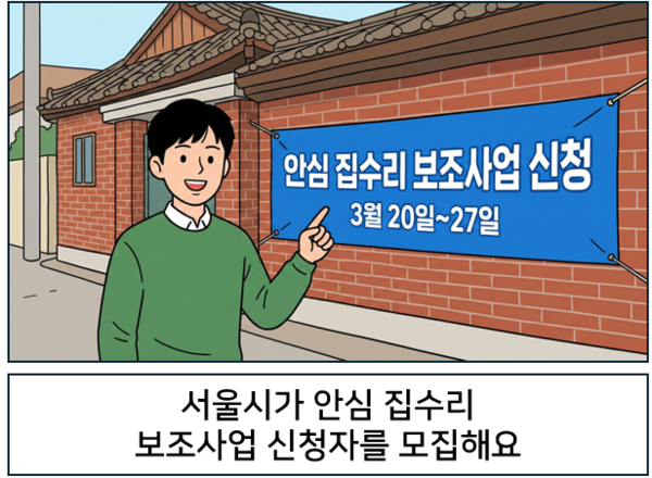 1 서울시가 오래된 집을 수리하는 '안심 집수리 보조사업'을 시작해요. 2 주거 취약가구와 돌봄을 받는 사람을 우선으로 지원해요. 3 안심 집수리 보조사업은 3월 27일까지 신청할 수 있어요. ©AI 편집실