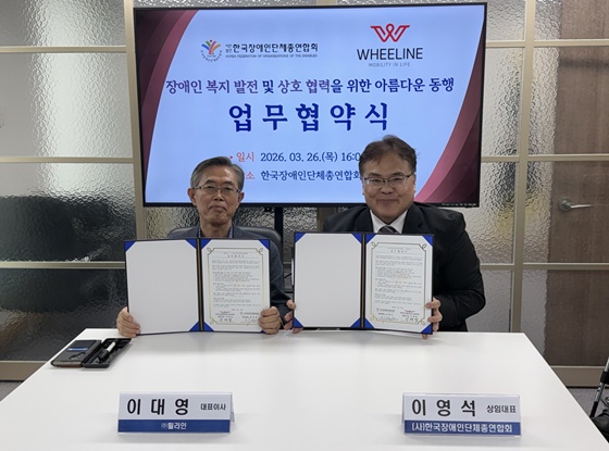 에이블뉴스 백민 기자】 한국장애인단체총연합회(이하 장총련, 상임대표 이영석)는 지난달 26일 (주)휠라인(대표이사 이대영)과 ‘장애인의 이동권 보장 및 자립생활 지원을 위한 업무협약’을 체결했다.