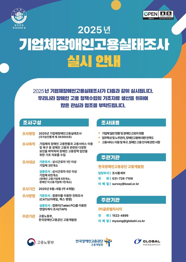 한국장애인고용공단은 “두 조사를 통해 장애인 고용시장에 대한 체계적인 이해를 바탕으로 실효성 있는 정책 기반을 마련하고, 현장의 목소리를 담아 보다 정밀한 고용서비스를 제공할 수 있을 것”이라고 밝혔다.