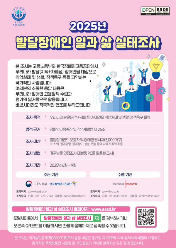 또한, ‘발달장애인 일과 삶 실태조사’는 지적·자폐성 장애인의 생활 전반과 취업 실태, 서비스 수요를 파악하기 위한 조사로, 오는 6월 23일부터 만 15세 이상 발달장애인이 있는 3,000가구를 대상으로 장애 당사자 및 보호자와의 면접조사 방식으로 진행된다.