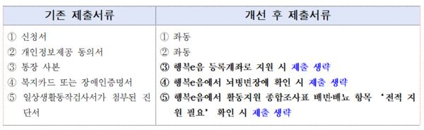 이번 개선으로 신청 시 제출해야 했던 ▲복지카드 또는 장애인증명서 ▲통장 사본 ▲일상생활동작검사서가 첨부된 진단서 등의 서류 일부가 생략 가능해졌다. 구체적으로, 행복e음 시스템을 통해 ‘뇌병변 장애’가 확인되면 장애인증명서 제출이 면제되며, 행복e음에 계좌가 등록돼 있으면 통장 사본도 제출할 필요가 없다.