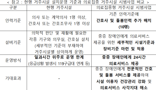 현행 거주시설 설치 운영 기준과 의료집중 거주시설 시범사업 비교 표 (자료 : 보건복지부)
