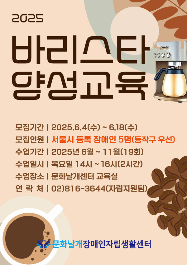 모집인원은 바리스타에 관심 있는 서울시 등록 장애인(동작구 우선)이다. 신청은 18일까지 문화날개센터 유선전화(02-816-3644, 내선1번)로 접수하면 된다. 보다 자세한 사항은 문화날개센터 홈페이지(http://cwcil.or.kr)를 확인하면 된다.