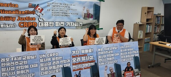 【에이블뉴스 이슬기 기자】전국장애인차별철폐연대(전장연)가 16일 서울 종로구 전장연 대항로 대강당에서 기자회견을 갖고, UN 장애인권리협약(CRPD) 당사국 회의에 맞춰 북미(미국, 캐나다)에 북미 AA(Against Ableism) CRPD 대표단을 파견한다고 선포했다.