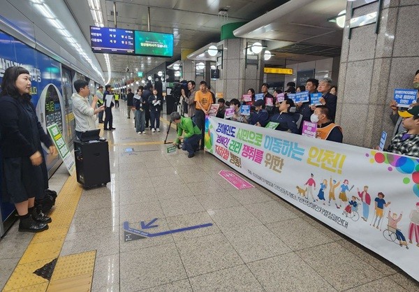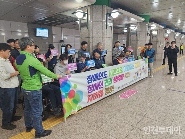 인천투데이=현동민 기자|인천장애인차별철폐연대와 시민사회 단체들이 인천시에 장애인 권리 보장을 촉구하며 다시 한 번 지하철 승강장에 섰다.