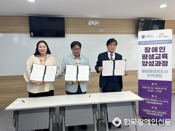 거제대학교(총장 박창근), 한국사회복지정책연구원(원장 김종인), 거제장애인복지관(관장 우성기)은 지난 12일 업무협약(MOU)을 체결하고 ▲장애인 평생교육 활성화 ▲발달장애인 직업능력 향상 및 자립지원 ▲교육 인프라 공동 활용 등을 주요 협력 과제로 삼아 상호 협력하기로 했다.