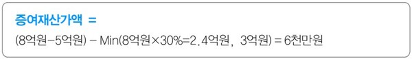 매수자(자녀 기준) 증여세=딸은 양도자(부모)로부터 시가보다 적은 가액으로 주택을 매수하였기 때문에 상속세 및 증여세법 제35조에 의거하여 증여세를 부담할 수 있습니다. 일단, 증여재산가액(증여세 과세가액)은 시가와 대가(매수가액)와의 차이에서 시가의 30%와 3억원 중 적은 금액을 빼서 계산하며, 증여재산가액은 6천만원이 됩니다.