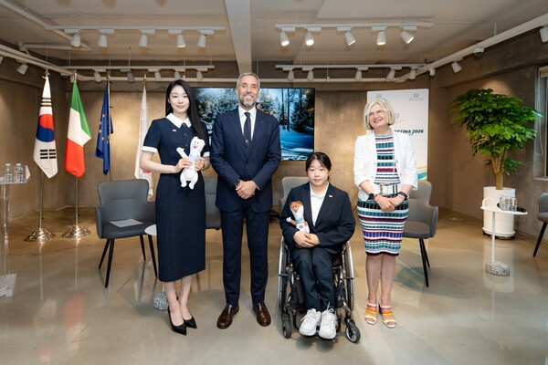 지난해 6월에 열린 2026 밀라노-코르티나 동계 올림픽 및 패럴림픽 공식 설명회. 왼쪽부터 피겨스케이팅 김연아, 대회 조직위 안드레아 바르니에르 CEO, 파라 노르딕 스키 김윤지, 에밀리아 가토 대사. ⓒ주한이탈리아대사관