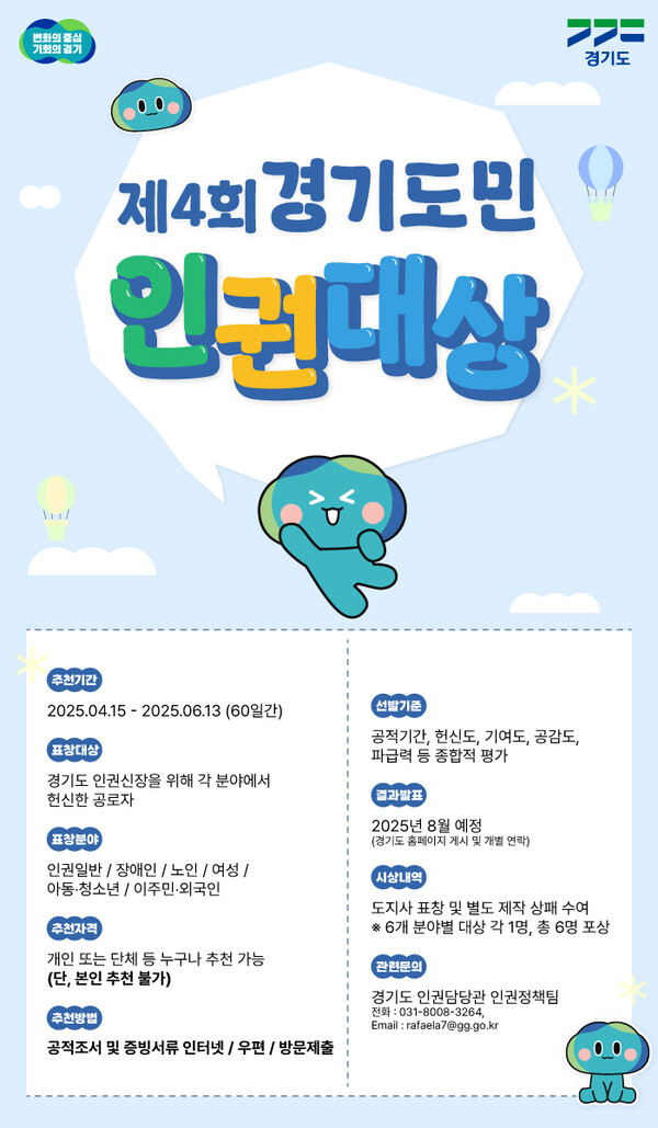 【에이블뉴스 이슬기 기자】경기도가 인권신장을 위해 공헌한 ‘경기도민 인권 대상’ 후보자와 인권존중 문화 확산을 위한 ‘경기도 인권 작품공모전’ 출품작을 오는 15일부터 6월 13일까지 모집한다.