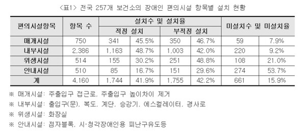조사 결과 총 4160개의 시각장애인 편의시설 조사 항목 중 적정 설치된 항목은 단 41.9%에 불과했다. 부적정 설치된 항목은 42.2%, 미설치된 항목은 15.9%로 조사돼 시각장애인의 보건소 이용과 접근에 많은 어려움이 있는 것으로 나타났다.