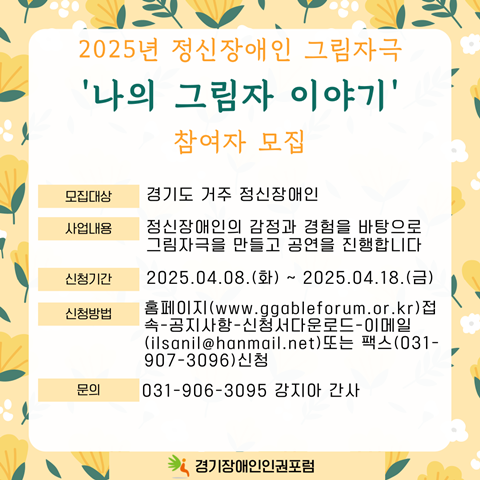 【에이블뉴스 백민 기자】 경기장애인인권포럼(대표 김재룡)은 오는 18일까지 정신장애인 문화예술 지원사업 그림자극 ‘나의 그림자 이야기’ 참여자를 모집한다.