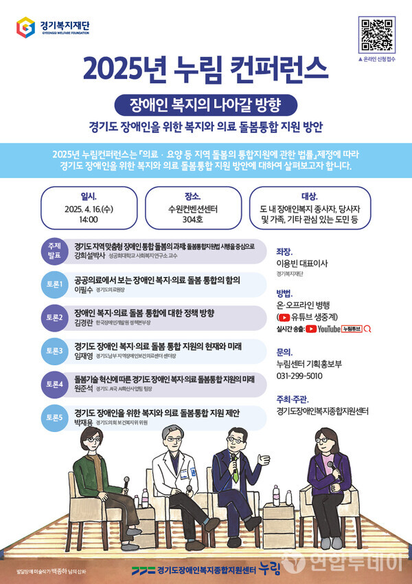 (경기=연합투데이) 경기도장애인복지종합지원센터(이하 누림센터)가 오는 4월 16일 오후 2시, 수원컨벤션센터에서 ‘장애인 복지의 나아갈 방향 – 경기도 장애인을 위한 돌봄통합 지원 방안’을 주제로 ‘2025 누림 컨퍼런스’를 개최한다.