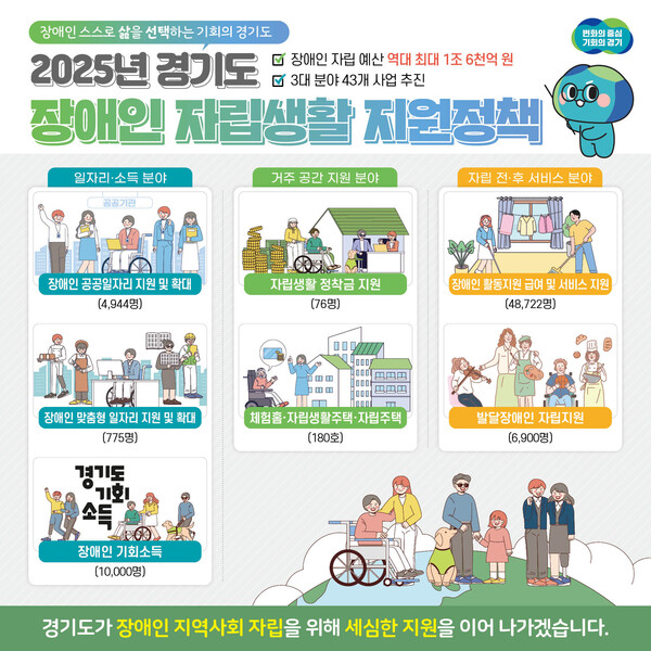 경기도는 ‘장애인 스스로 삶을 선택하는 기회의 경기도’를 비전으로 지역사회 자립생활 실현을 위한 환경조성을 위해 3대 영역으로 나눠 43개 세부사업을 추진할 계획이다. 올해 예산은 국비 9067억 원, 도비 1539억 원, 시군비 5371억 원으로 구성됐다.