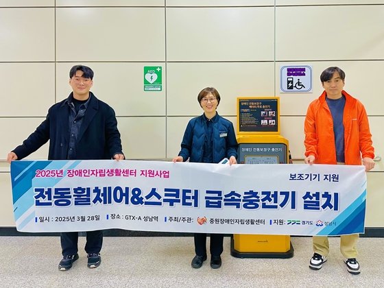 【에이블뉴스 백민 기자】 중원장애인자립생활센터(이하 중원IL센터)는 지난 28일 GTX-A 성남역 지하 2층 맞이방 5번 출구 방면에 전동휠체어 및 전동스쿠터용 급속충전기를 설치했다.