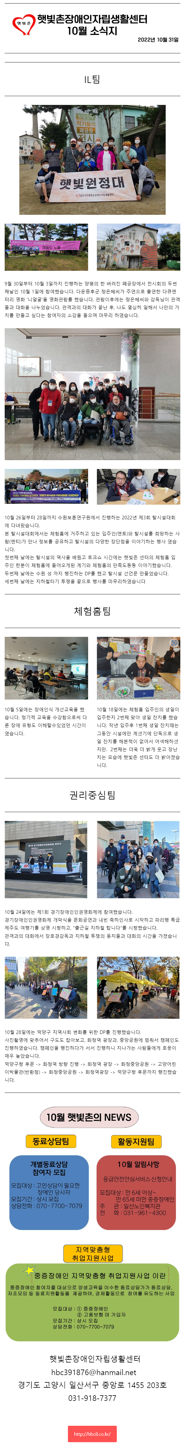 2022년 10월 햇빛촌 소식지 페이지 정보 작성자 햇빛촌 조회 1,602회 작성일 22-11-14 09:27 본문 2022년 10월 햇빛촌 소식지입니다 목록 이전글권리중심 중증장애인 맞춤형 공공일자리 전국순회(경기)취업박람회 안내 22.11.23 다음글2022년 10월 후원금 수입 내역 보고 22.11.08 댓글목록 댓글목록 등록된 댓글이 없습니다.